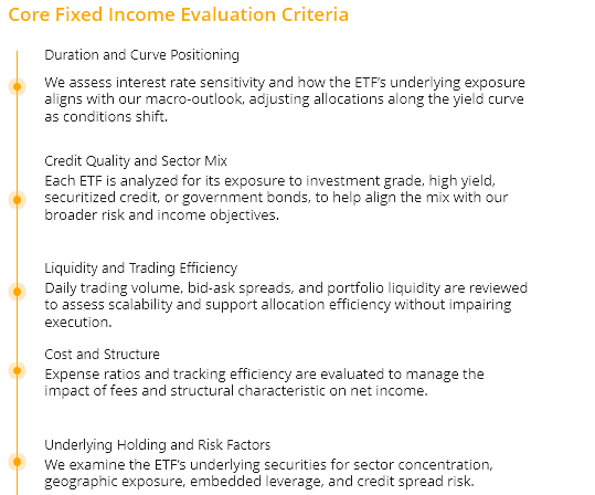 The foundation of the portfolio is a diversified allocation (40–70%) to fixed income ETFs. These instruments provide transparent, liquid access to exposure across the bond market, allowing the investment team to actively manage duration, credit quality, sector mix, and curve positioning. By using ETFs as the core, the strategy is intended to balance implementation discipline with tactical flexibility, allowing the portfolio to adapt to evolving macro and interest rate environments.